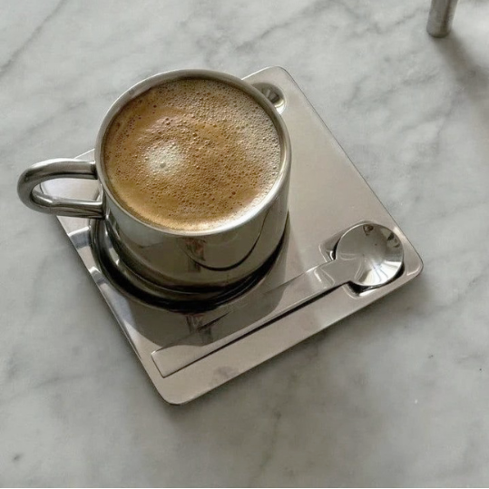 alle dele udført i højglanspoleret stål, der reflekterer lys og omgivelser med næsten spejlblank finish. Sættet føles både futuristisk og tidløst. Meget smukt sæt.